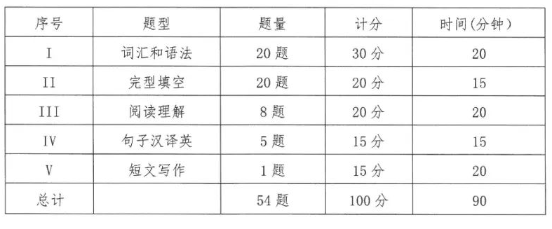 试卷题型分为五个部分:词汇和语法、完形填空、阅读理解、句子翻译和短文写作。