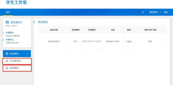 在通知时间会开放【打印准考证】及【成绩查询】窗口供考生查询下载